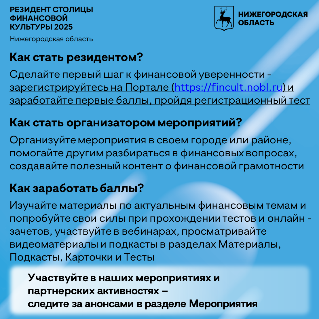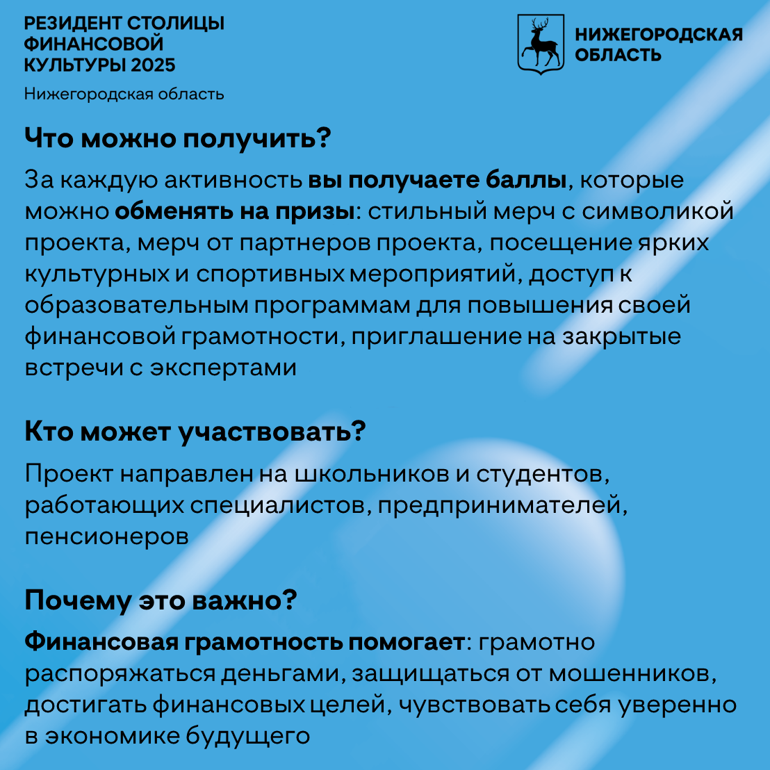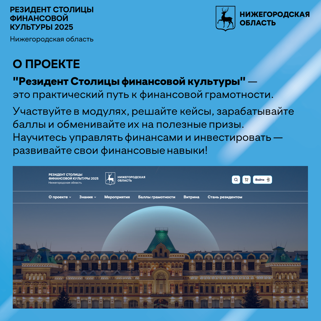 По результатам Всероссийского конкурса, проводимого Минфином России и Центробанком России,  Нижегородская область получила статус "Столица финансовой культуры 2025", представив в финале конкурса новый интерактивный проект "Резидент столицы финансовой культуры".